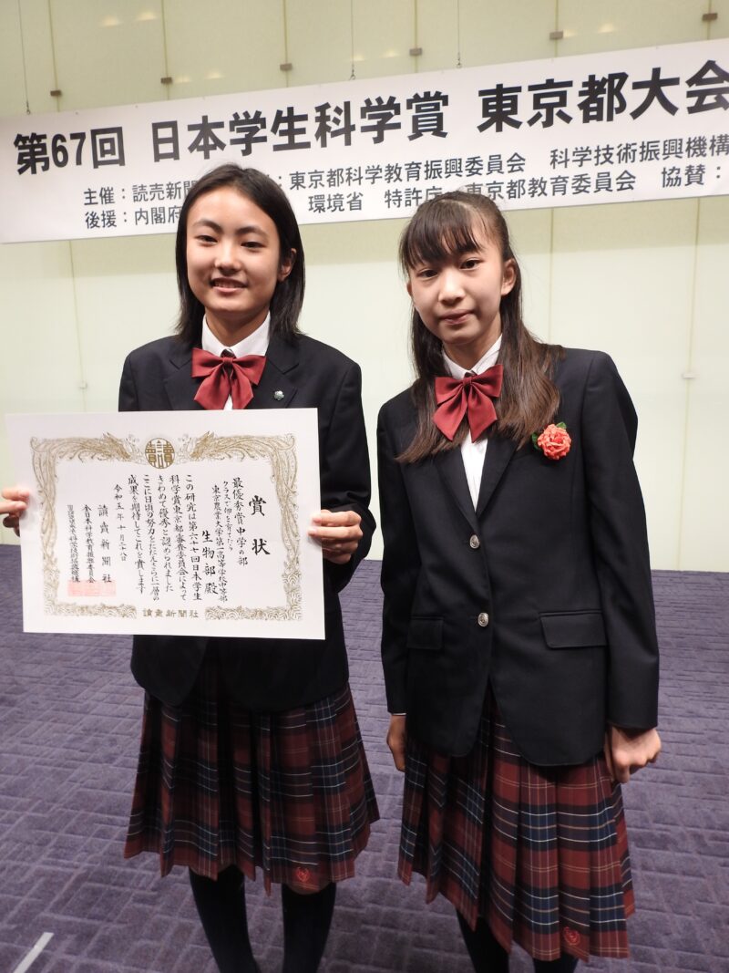 第67回日本学生科学賞 2年連続東京都最優秀賞受賞 生物部中等部1年生が応募数216作品の中から、本年度の東京都の最高峰である最優秀賞に輝き、都代表として中央審査(全国大会)へ進むこととなりました。出場は2年連続の快挙で、昨年最優秀賞受賞を受賞した現中3生は全国大会で入選1等になりました。今回の研究テーマは「クラスで卵を育てたら」。農大一中らしく、入学式に教室で温め始めた卵の、重量減少に気づいたのが研究のきっかけです。