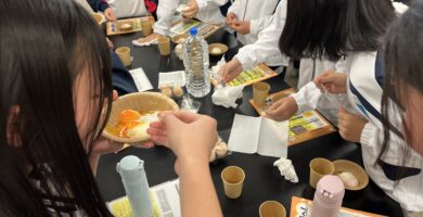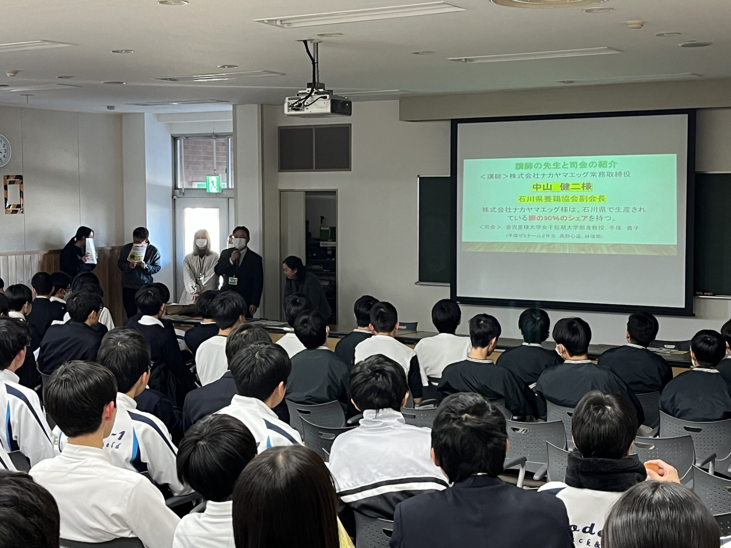本校元家庭科教員で金沢星稜大学女子短期大学部経営実務科准教授の手塚貴子先生から卵を使ったタンパク質の摂取方法などを教授していただき、農大農学部卒業生で石川県養鶏協会副会長(株式会社ナカヤマエッグ常務取締役)の中山健二さんから石川県の養鶏事情などを伺い、手塚ゼミナールの高野さんと林さんから卵を使ったタンパク質を摂取できるお菓子を紹介していただきました。講習会の最後には、石川県産の温泉卵を実食させていただき、メレンゲクッキーのお土産まで頂きました。