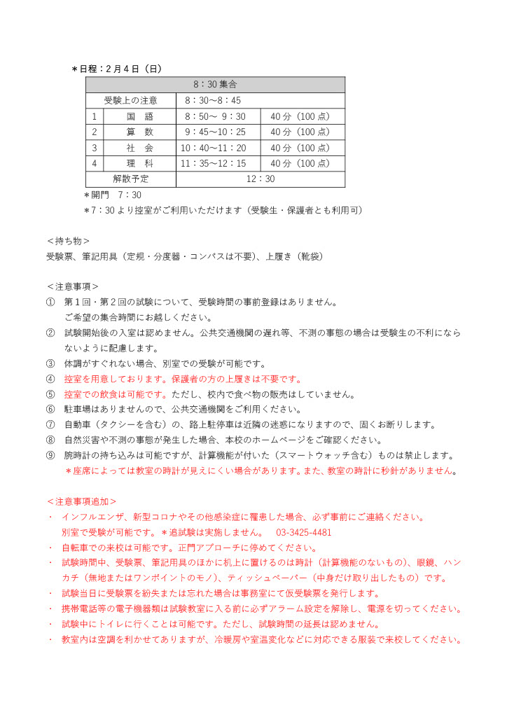 中等部入試の募集要項について注意事項の追加を下記に更新しました。