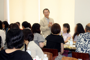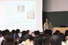 今年度は「若さを保つ食生活~発酵食品とアンチエイジング~」をテーマに、委員含め157名が参加。発酵食品の歴史や体に良い発酵食品、酔いのメカニズム等、中西先生から興味深いお話を伺った後は、ドイツ・イタリア・フランスそれぞれの白ワインの試飲と発酵食品を含むおつまみの試食をしながらの歓談タイム。先生も各テーブルをまわって下さり、講座についてのお話や、お子さんのお話等、大変盛り上がりました。