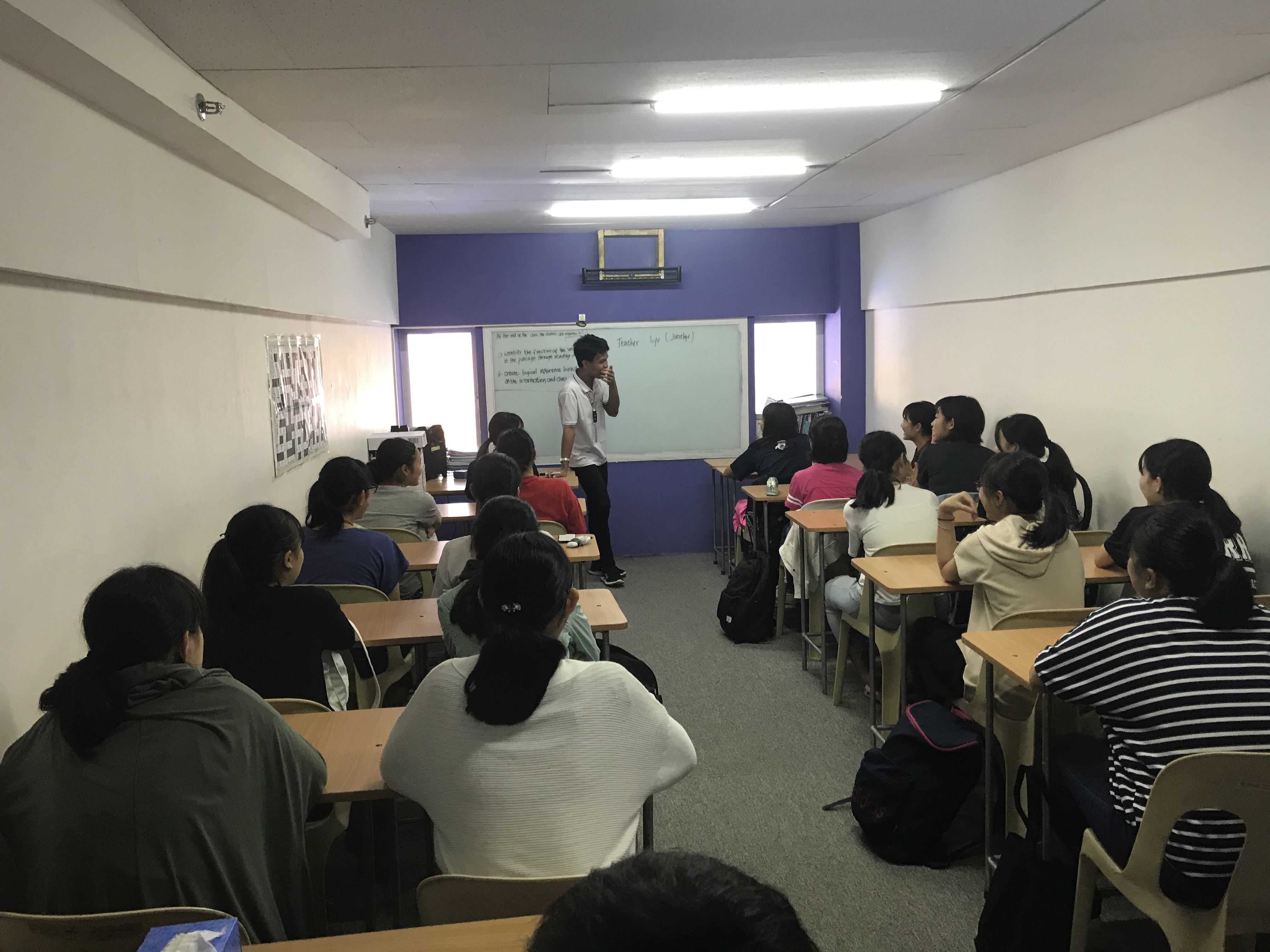 セブ島での語学研修2日目となりました。 天候はやや薄曇りですが、晴天で蒸し暑いです。気温は30℃を超えています。 午前中は、全員4技能のレベルチェックテストを受けました。 午後は、2グループに分かれてのグループレッスン90分を3コマ、夕食後はマンツーマンレッスン90分を1コマ受講しました。20時55分にレッスンすべて終了です。 本格的な研修スタートで、英語のシャワーを浴びています。