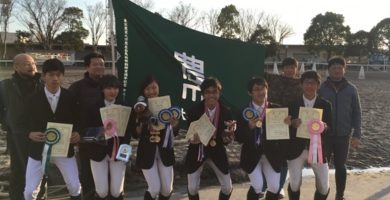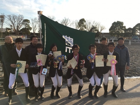令和元年12月13日(金)~15日(日)に行われました関東高等学校自馬競技大会において、2年9組の佐渡蒔結子さんが小障害80cmと馬場馬術競技で優勝、主将池田観裕くんが小障害90cmで優勝、クロス&バーティカル競技で2年4組坂本和也くんが優勝しました。また、2年8組の神谷詩さんが馬場馬術L1競技と中障害で上位入賞し、関東最優秀選手に選出されました。すべての種目の総合点で本校馬術部が関東大会で団体総合優勝を果たしました。これからも馬術部は、人馬一体の精神で日々精進していきたいと思います。