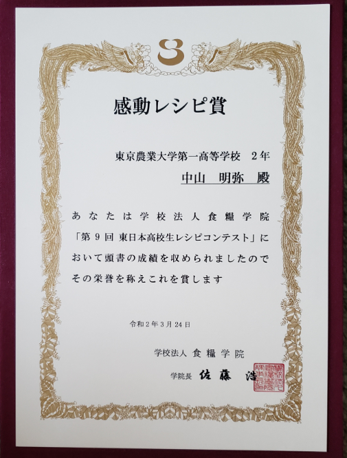 学校法人 食料学院主催 食育活動の一環として東日本にお住まいの高校生の皆さんを対象とした 「第9回東日本レシピコンテスト」において、本校 高校3年生 中山明弥さんが「感動レシピ賞」を受賞しました。