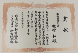 岩波ジュニア新書&ちくまプリマー新書合同企画「 中高生が作る新書POPコンクール 」にて、中学2年生 磯村 和君の作品が優秀作品に選ばれました。総応募者数6000以上の中から優秀作品に選ばれただけでなく 特別審査員である南伸坊さんが選んだ「この1枚」に選ばれました。「POPを見た人を『へぇー!』と思わ せ、デザインもいけている」との講評でした。
