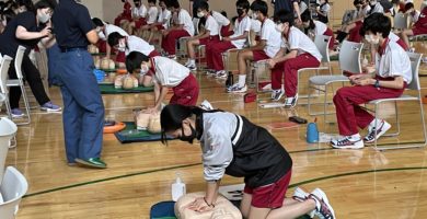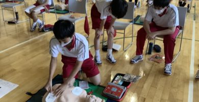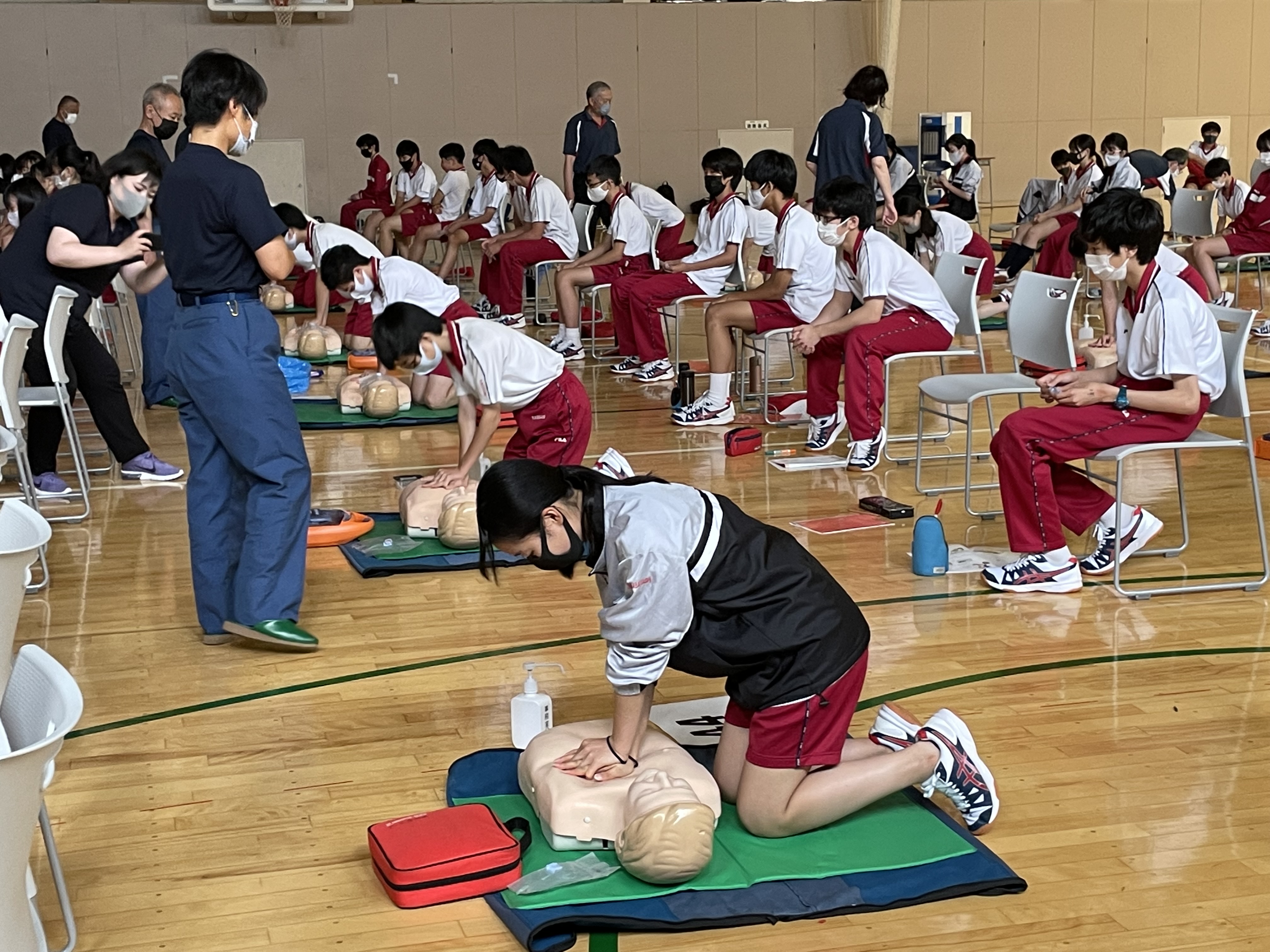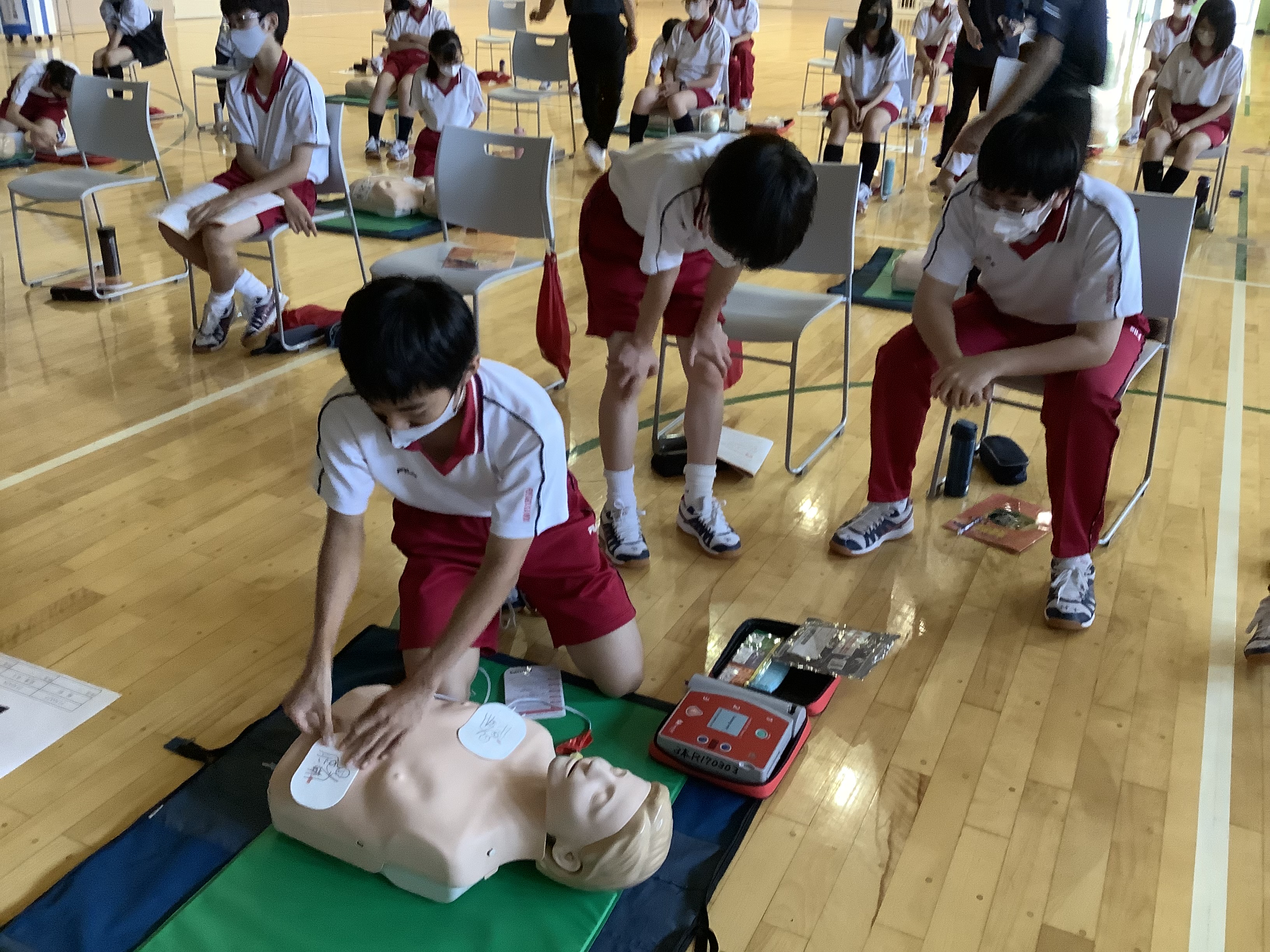 生徒たちは、心肺蘇生法やAEDの使い方を実際に体験しながら真剣に学びました。