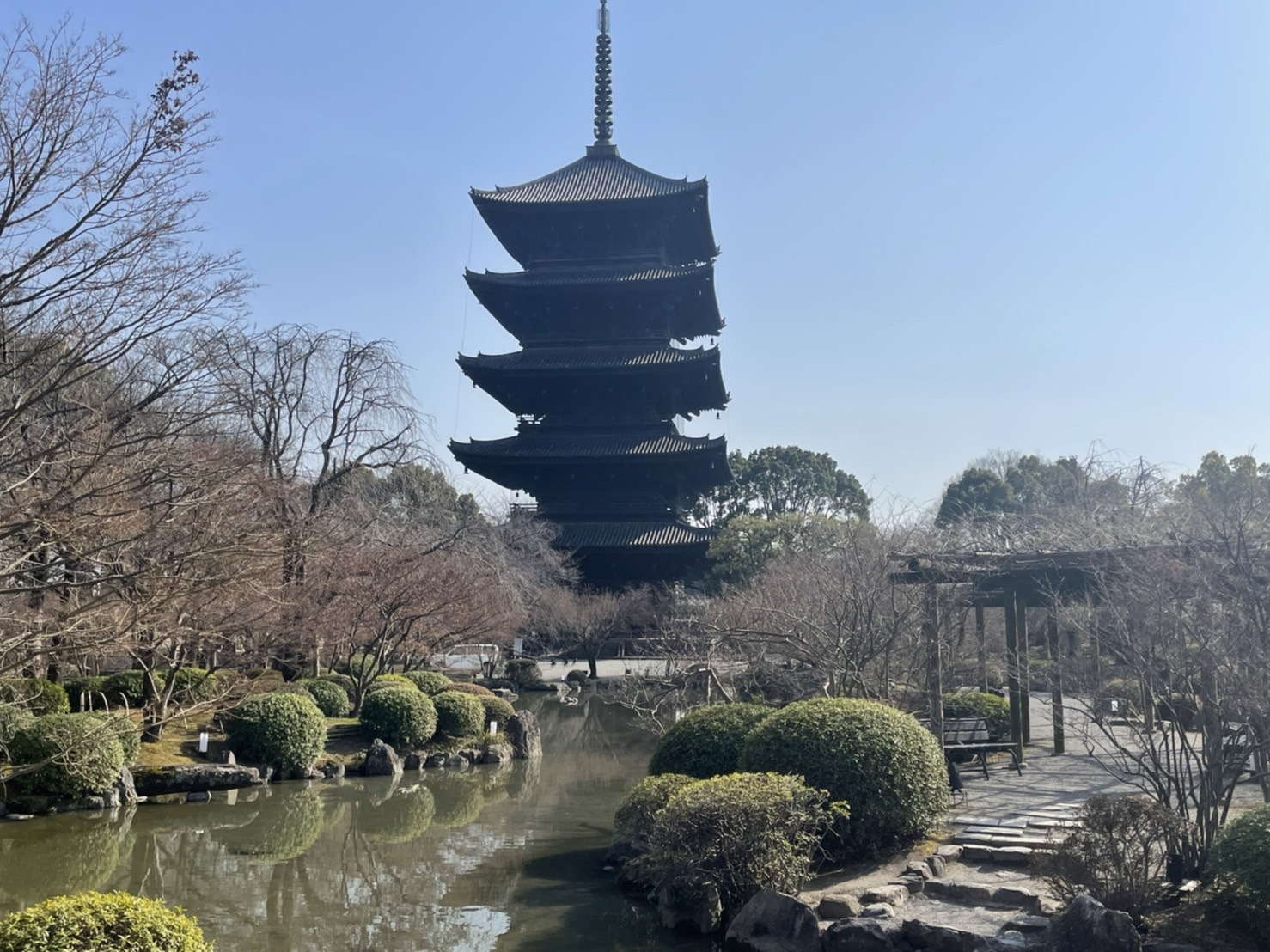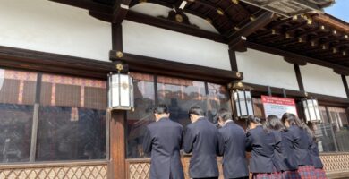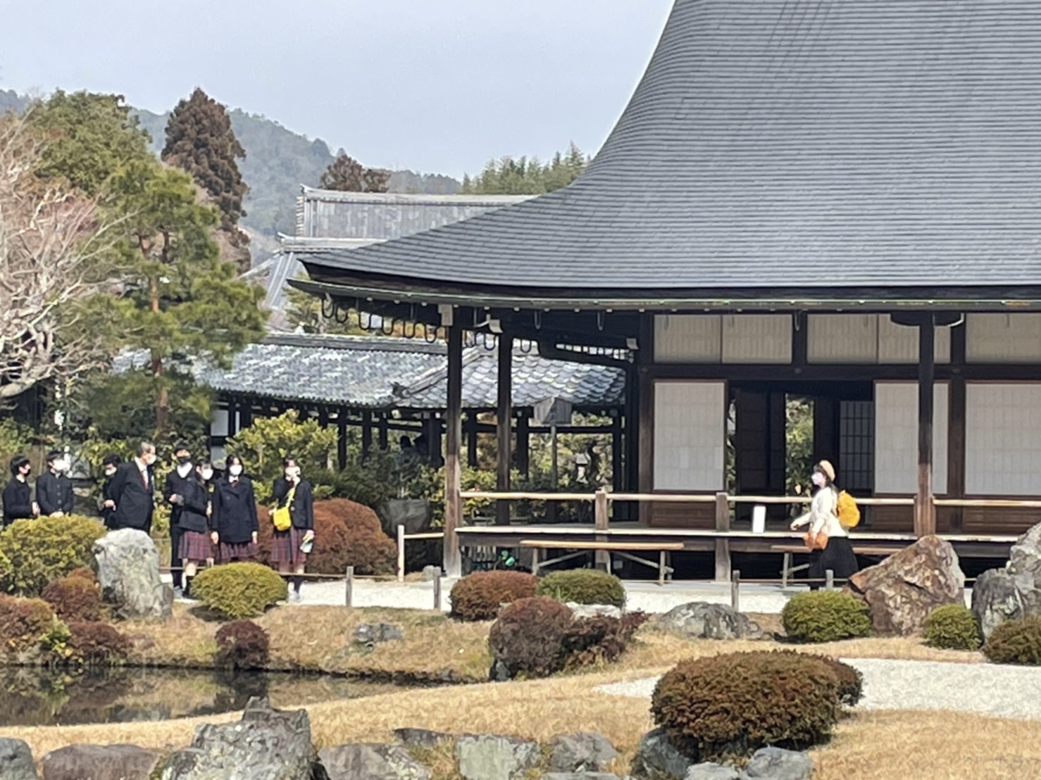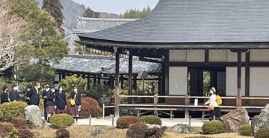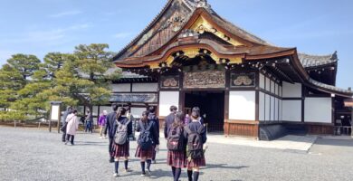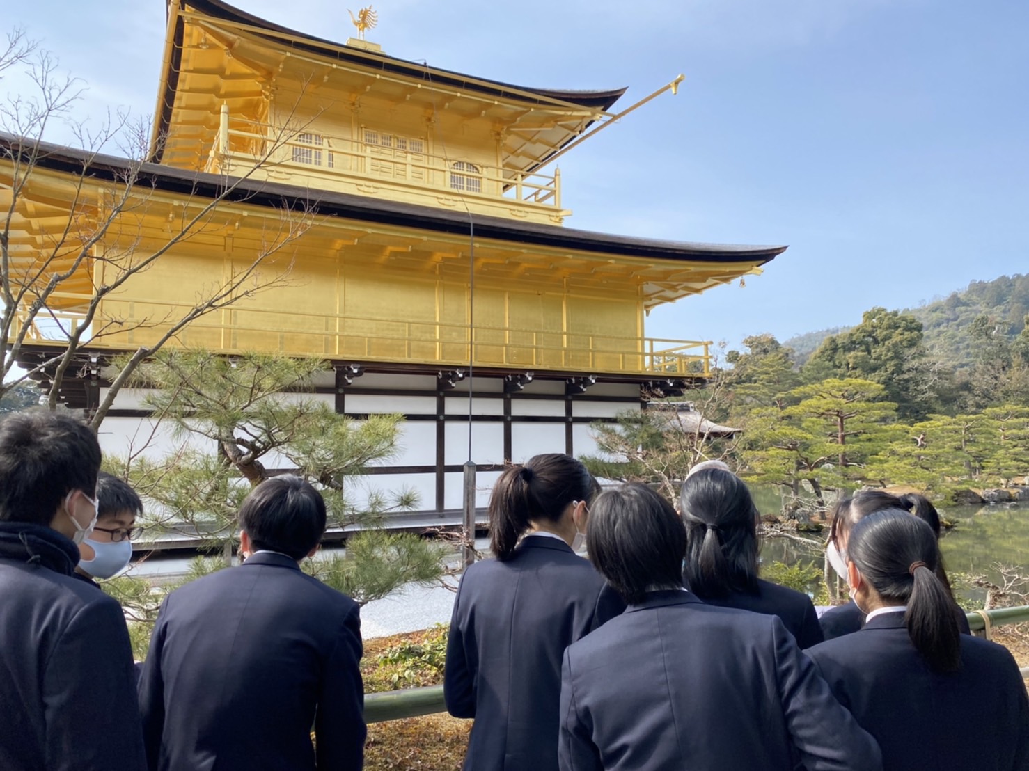 本日、3日目も好天に恵まれ、タクシー班別自主研修が1日行われました。事前に各班で計画した行程をもとに、歴応2年吉野で亡くなった後醍醐天皇の菩堤を弔うために足利尊氏が夢窓国師を開山として創建した「天龍寺」、延暦13年桓武天皇は動乱の中に奈良から長岡京を経て平安京へと都を遷され羅城門の東西に大寺を置いた「東寺」。鎌倉時代の公卿、西園寺公経の別荘を室町幕府三代将軍の足利義満が譲り受け、山荘北山殿を造ったのが始まりとされている、正式名称を鹿苑寺といい、相国寺の塔頭寺院の一つである「金閣寺」、他には「下鴨神社」「二条城」の寺社仏閣などの歴史的建造物を見学しました。更には、日本文化の体験として「和菓子作り」に挑戦した班もありました。今日は、本物の日本の歴史、文化に触れる実学に大満足でした。いよいよ明日の最終日は、バス・電車で移動する班別自主研修です。