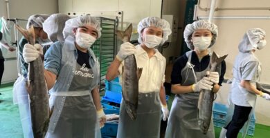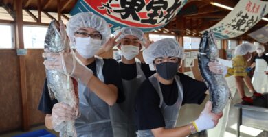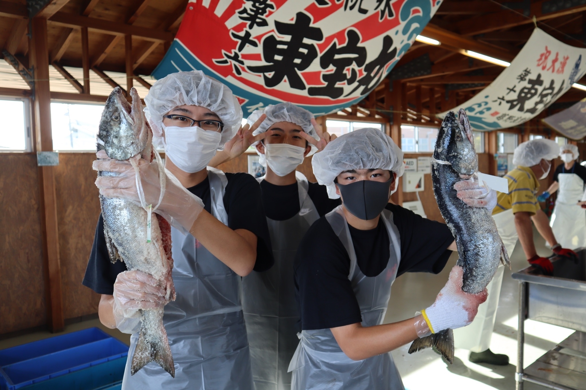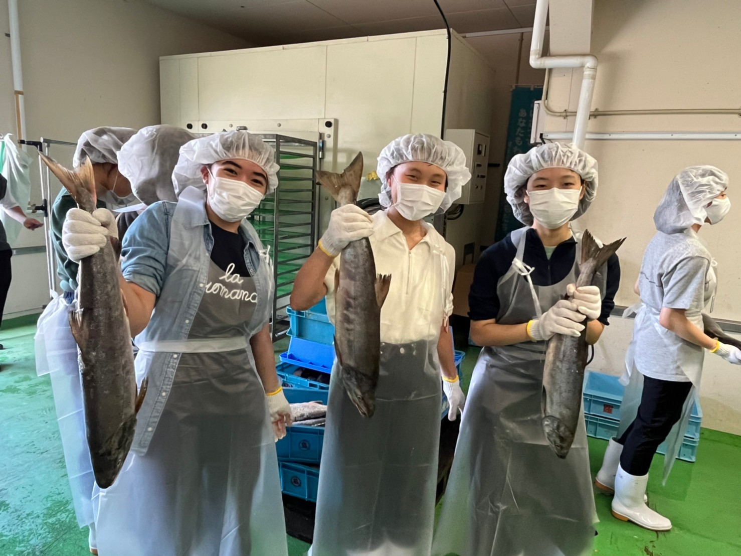 その後標津町へと移動し、標津町から見える国後島を眺めながら北方領土問題について考え、鮭の生体や様々な種類についてサーモン科学館で学び、新巻鮭作りを通して第一次産業について体験しました。