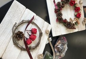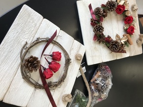材料のブリザーブドフラワーとアートフラワーとリボンを個々のオリジナリティあるデザインに配置し、クリスマスでも普段でも飾れる素敵なリースに仕上げました。壁だけでなくスタンド式にしても飾れるので、見るアングルによって飾り付け方を変えることも学びました。